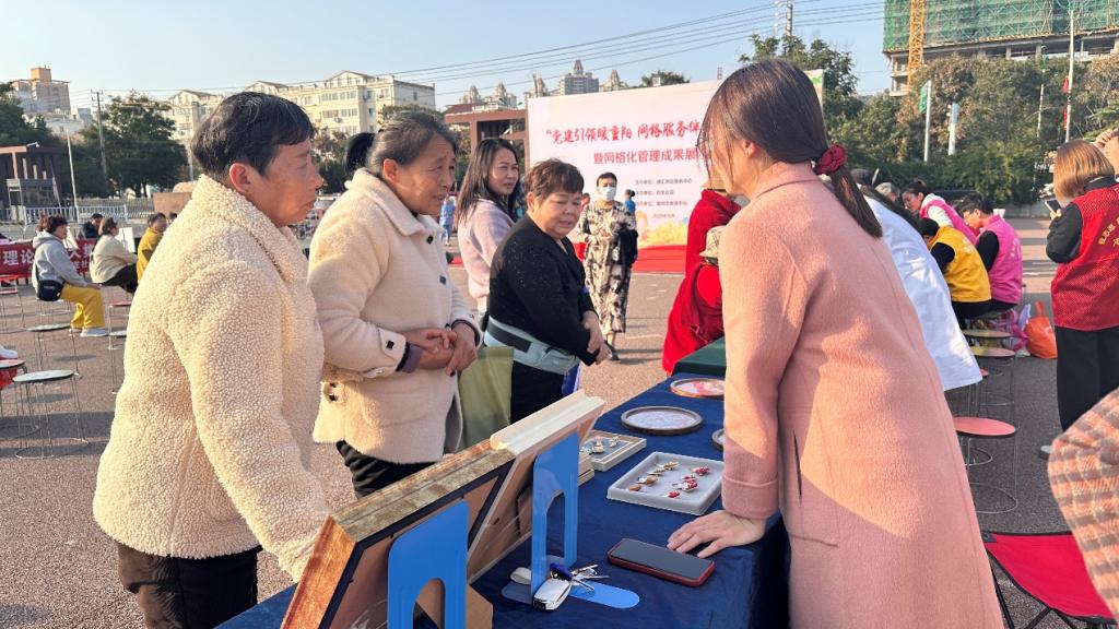 活动中,社区大学的老师将夜校项目中的作品进行了展示,珠绣作品熠熠生辉,蜡染、扎染布艺散发着独特的民族韵味......,这些丰富多彩的终身学习课程吸引了大量社区居民驻足咨询,表现出浓厚兴趣。