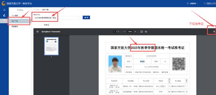 5. 选择左上角 资料下载,点击对话框中选择 国家开放大学2025秋季学期期末统一考试 ,会出现当学期本人准考证。